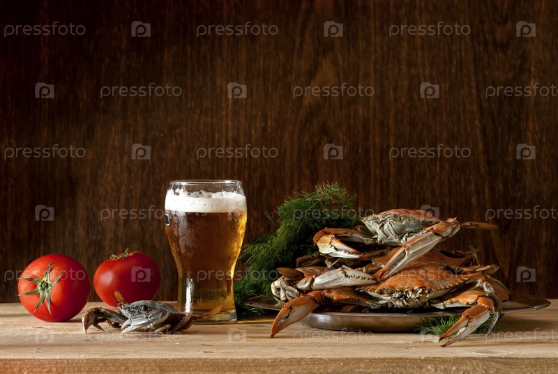 Пиво с крабами на столе