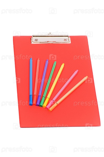 Красный блокнот и разноцветные карандаши
