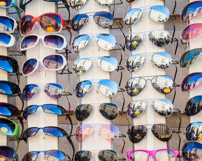 Много солнцезащитных очков на витрине в магазине