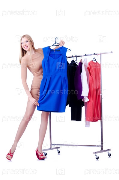 Женщина меряет новую одежду на белом фоне