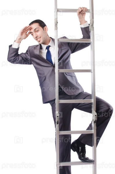 Бизнесмен поднимается по лестнице, изолированный на белом фоне