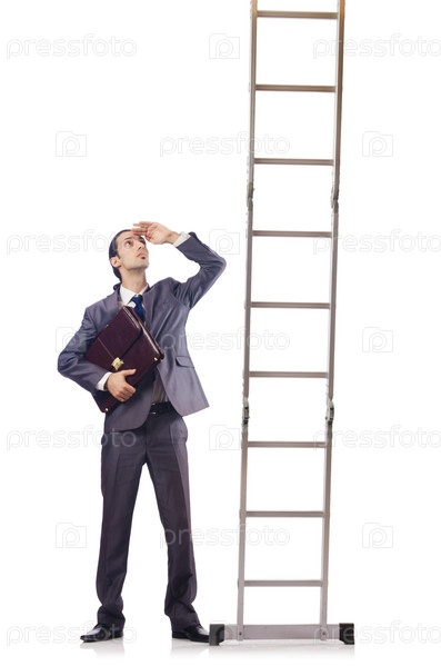 Бизнесмен поднимается по лестнице, изолированный на белом фоне