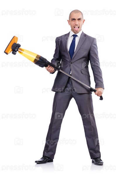 Бизнесмен пылесосит на белом фоне