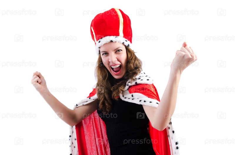 Бизнес-леди в костюме королевы, изолированная на белом