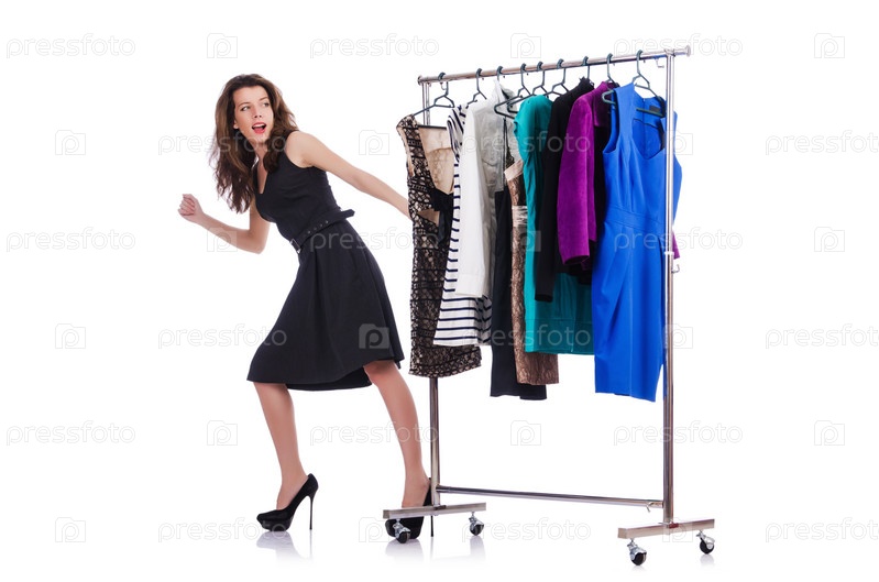 Женщина примеряет новую одежду на белом фоне