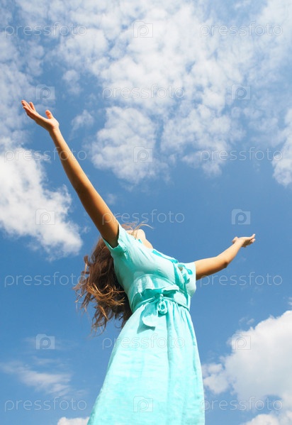 Девушка с распростертыми руками на фоне неба