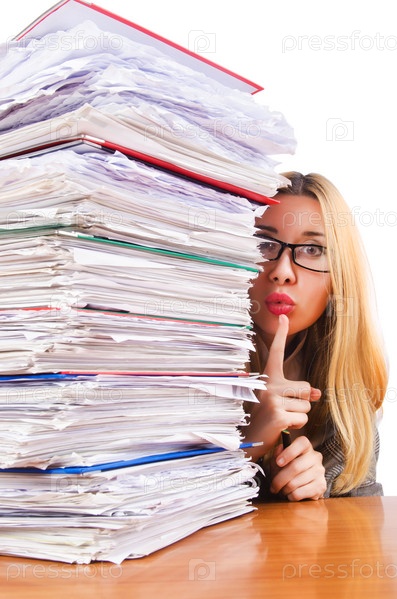 Занятая женщина со стопками бумаг