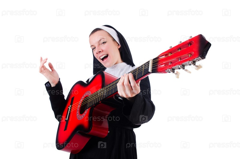 Монахиня играет на гитаре, изолированная на белом фоне