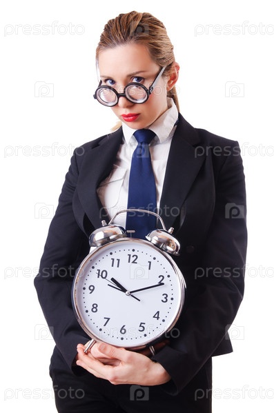 Деловая женщина-ботаник с огромным будильником