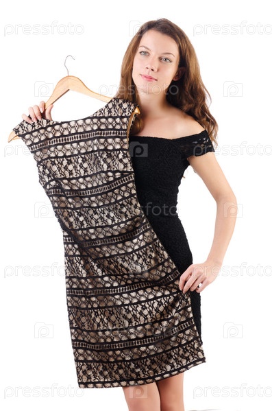 Молодая женщина примеряет новую одежду на белом