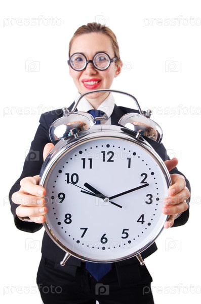 Деловая женщина-ботаник с огромным будильником