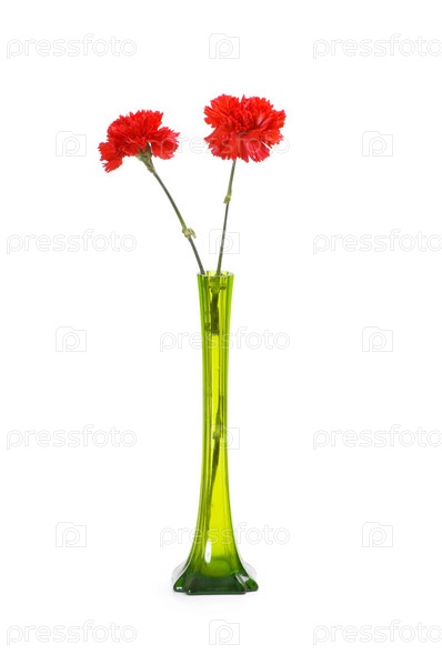 Две красные гвоздики в вазе на белом фоне