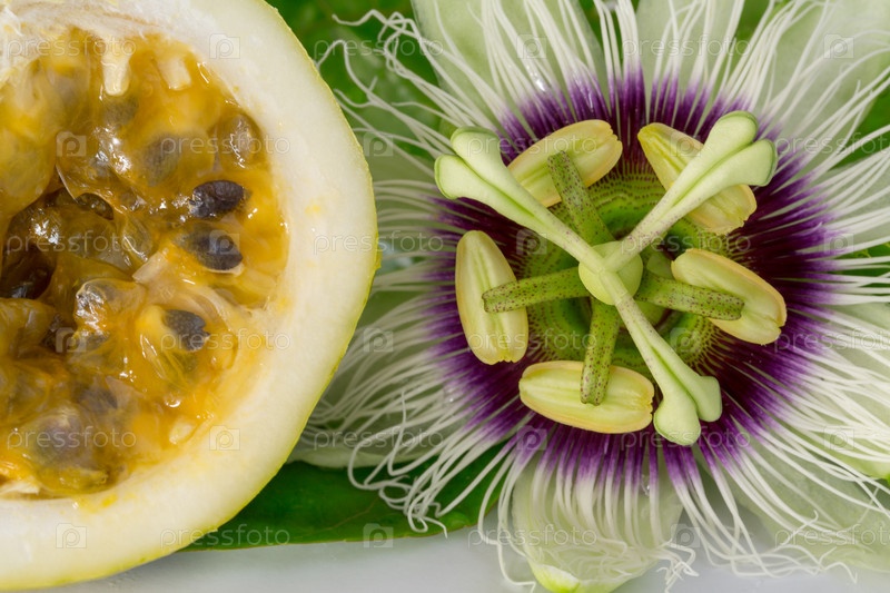 Цветок маракуйи и спелая разрезанная маракуйя, макро