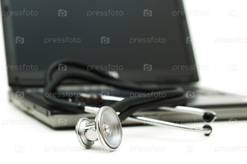 Ноутбук и стетоскоп крупным планом на белом фоне