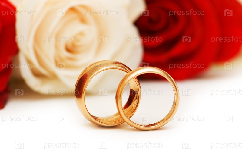 Золотые обручальные кольца на фоне роз