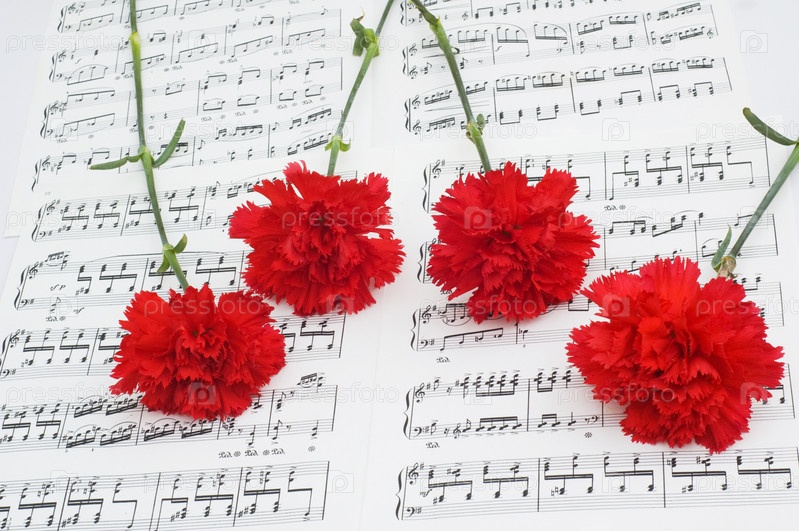 Романтическая композиция - красные гвоздики на нотном письме