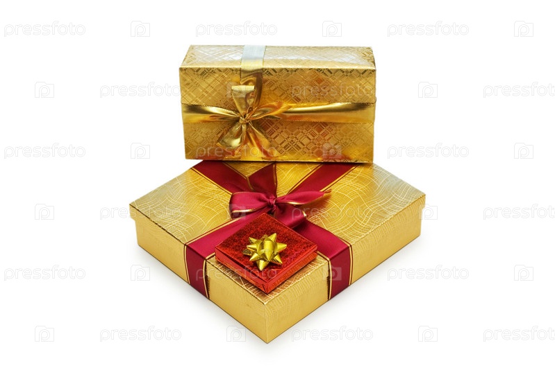 Подарочные коробки в золотой обертке на белом фоне