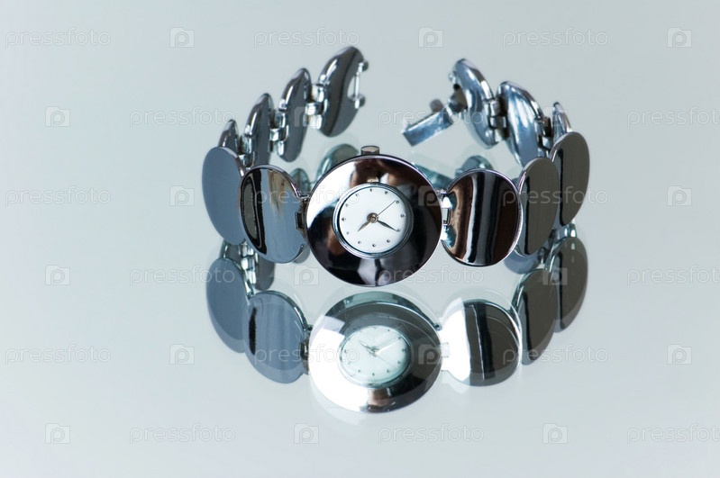 Стильные наручные часы на отражающей поверхности