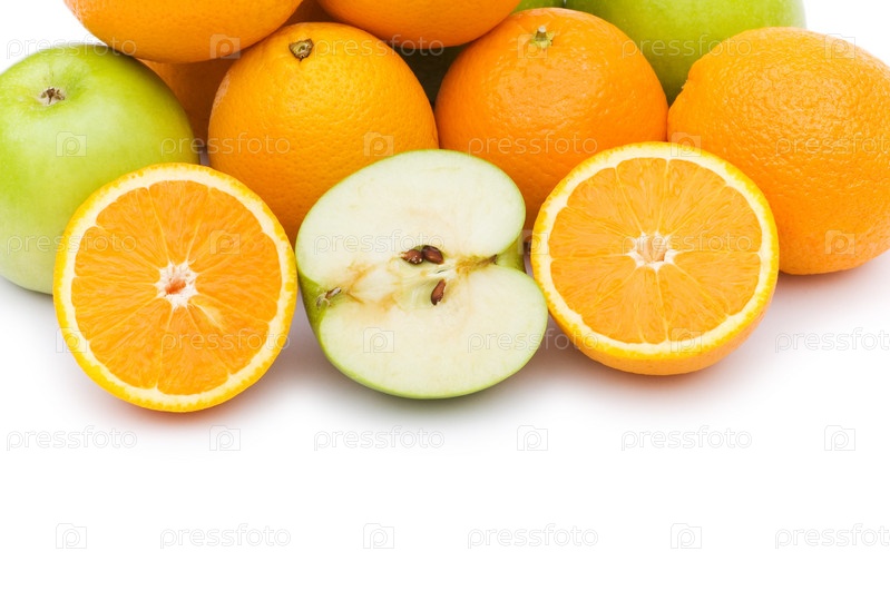Яблоки и апельсины на белом фоне