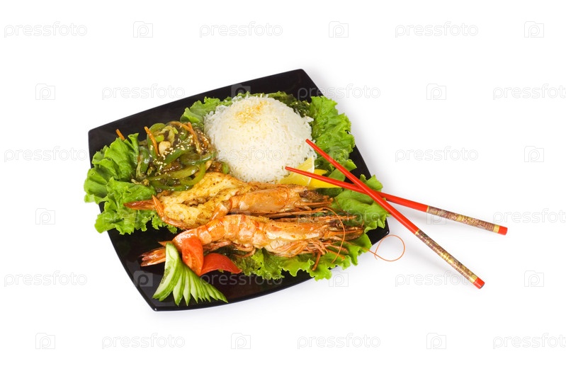 Омар, пожаренный на гриле, рис и овощи