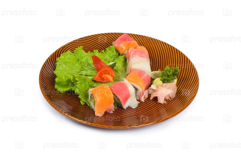 Суши с тунцом и лососем на тарелке