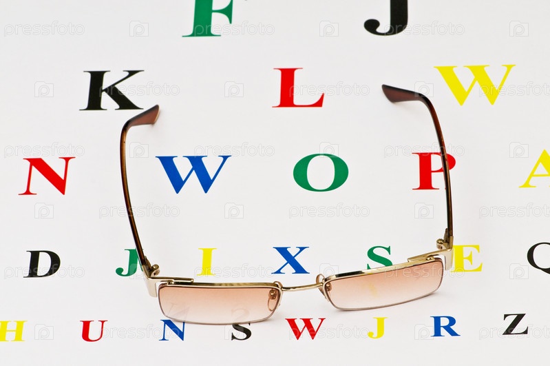 Очки на фоне цветных букв английского алфавита
