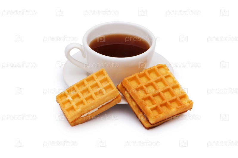 Чай с бельгийскими вафлями, изолированный на белом