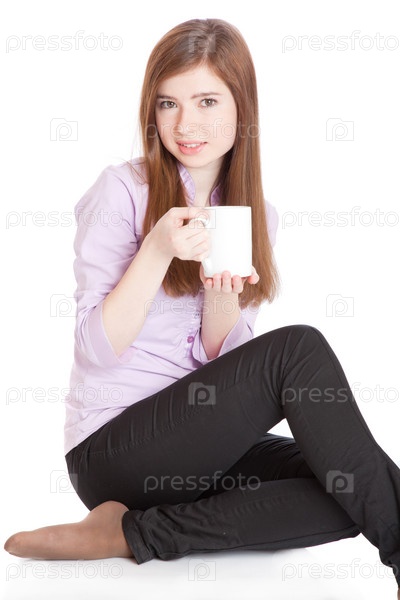 Девушка с кружкой кофе в руках, на белом фоне