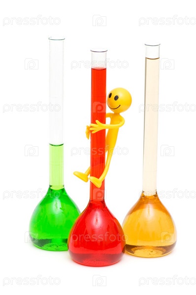 Фигурка человечка рядом с разноцветными колбами на белом фоне