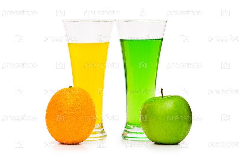 Яблочный и апельсиновый коктейли на белом фоне