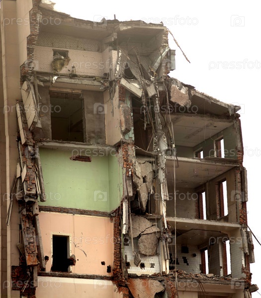 Разрушенное здание, землетрясение, бомба, террористическое нападение или стихийное бедствие, концепция