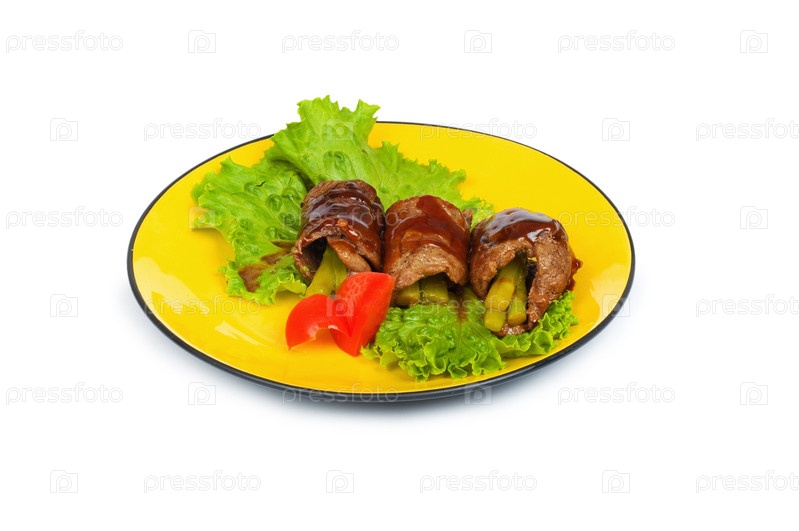 Рулетики из говядины с овощами на тарелке на белом фоне
