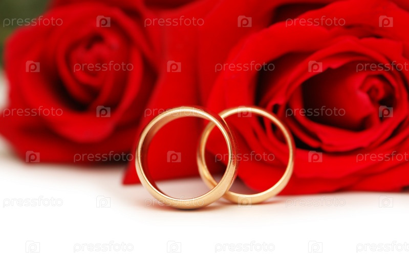 Два обручальных кольца на фоне красных роз