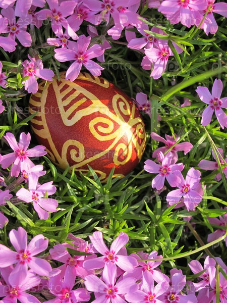 Хорватское традиционное пасхальное яйцо на розовых цветках