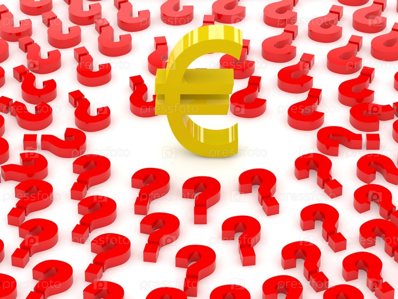 Знак евро, окруженный вопросительными знаками. Концептуальная 3D-иллюстрация