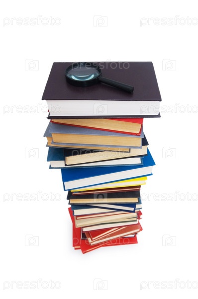 Стопка книг с лупой на белом фоне