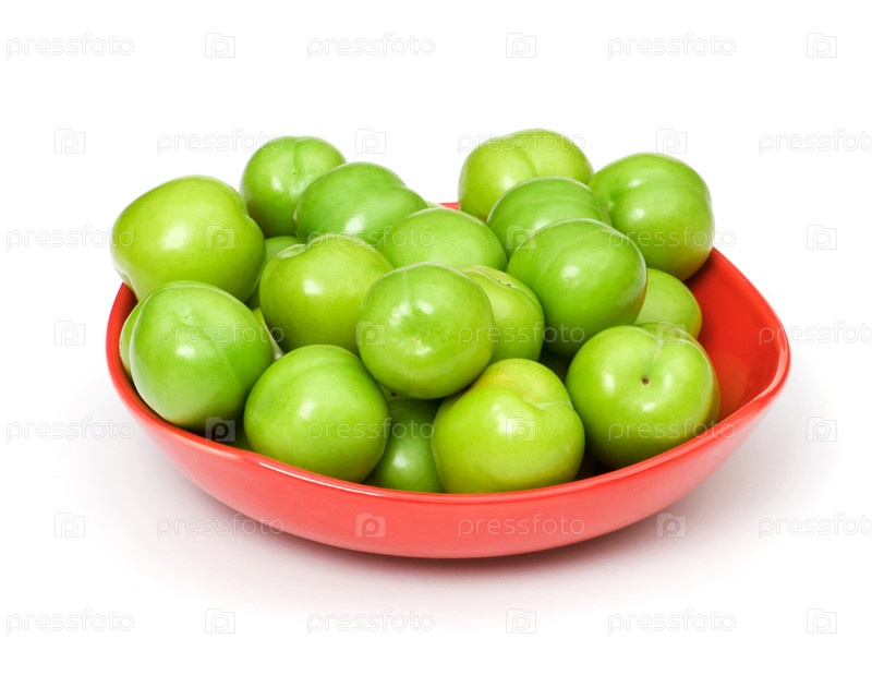 Блюдо зеленых слив на белом фоне