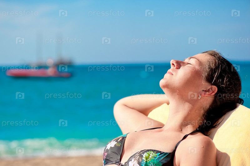 Девушка принимает солнечные ванны на фоне моря и шхуны