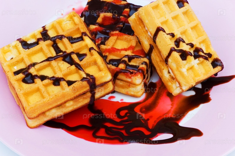 Бельгийские вафли с шоколадным и клубничным сиропом на тарелке