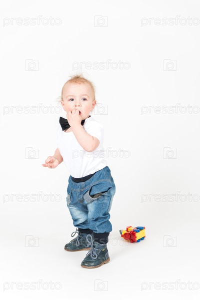 Маленький мальчик стоит на белом фоне