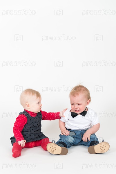 Двое детей сидят на белом фоне