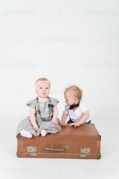 Два младенца с чемоданом на белом фоне