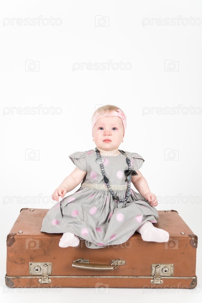 Маленькая девочка с чемоданом на белом фоне