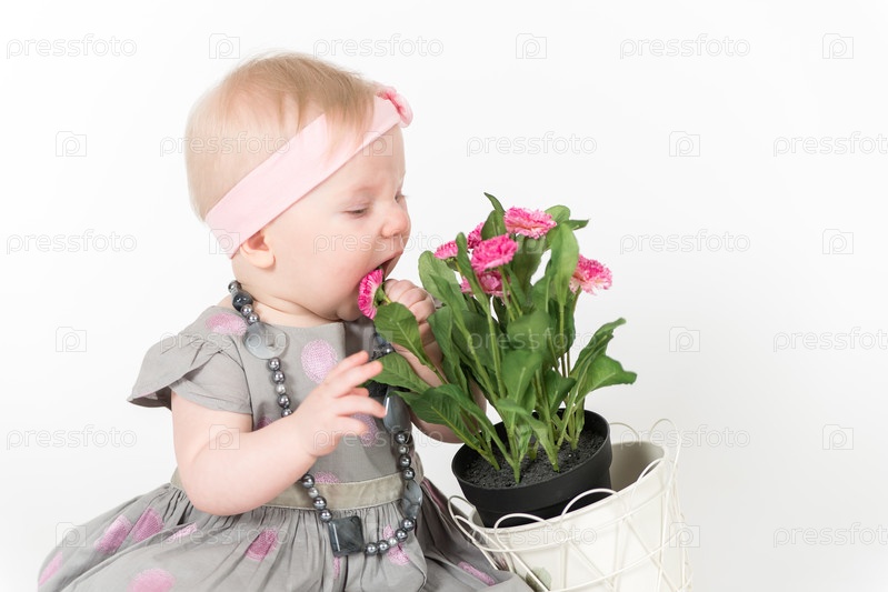Маленькая девочка в сером платье на белом фоне