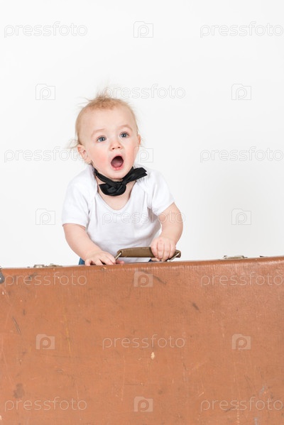 Маленький мальчик с чемоданом на белом фоне