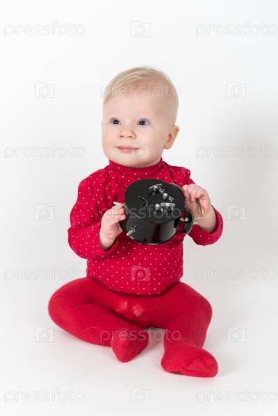 Ребенок в красном костюме сидя с часами