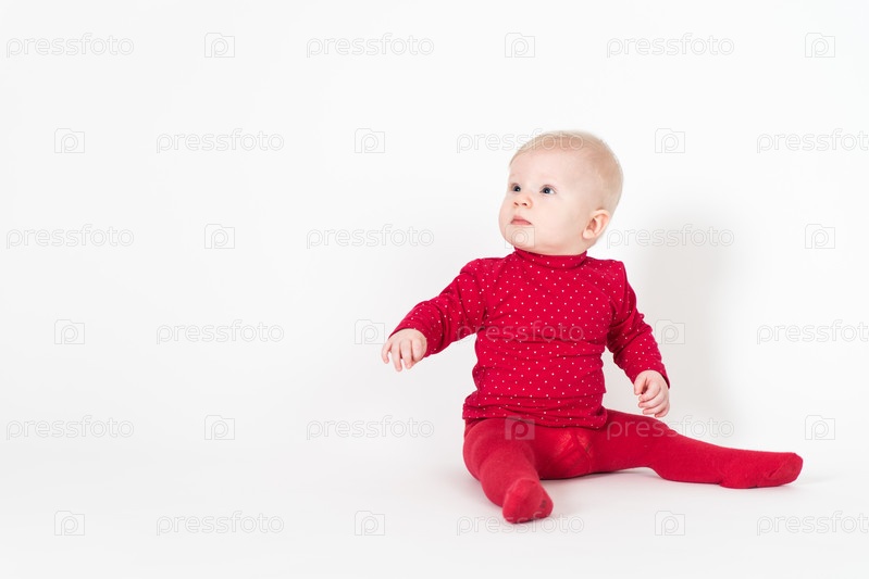 Симпатичный ребенок в красном костюмчике сидит на белом фоне