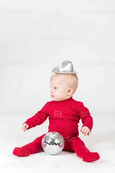 Улыбающийся ребенок в красном с диско-шаром