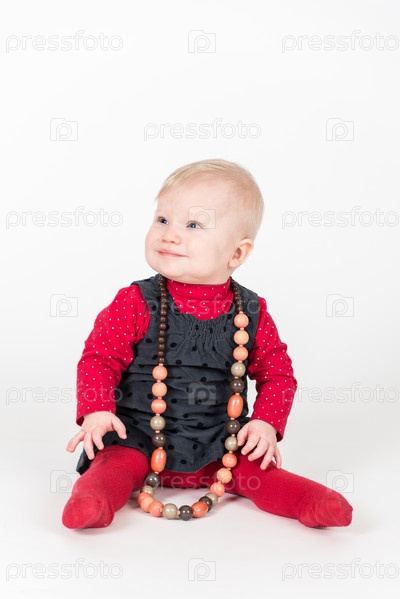 Девочка в сером платье сидит на белом фоне
