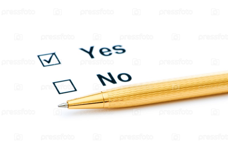 Ручка и галочка против слова "Да" на белом фоне